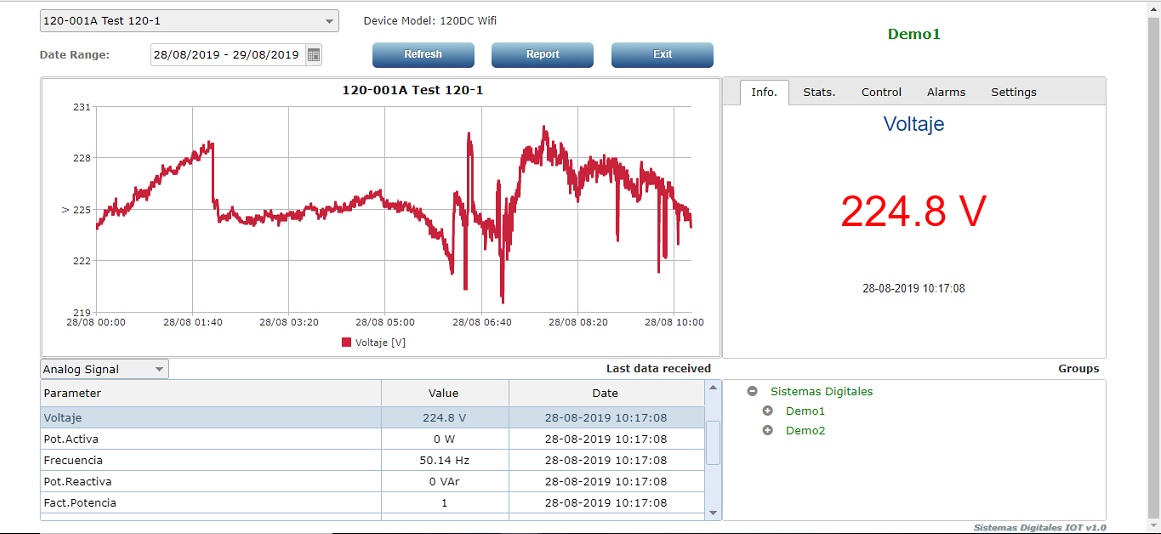 ![]() En gráfica voltaje obtenido por modbus Master desde el monitor de energía. Se capturan además Potencia Activa, Potencia Reactiva, Frecuencia, Corriente, Factor de Potencia, Energia total. | |